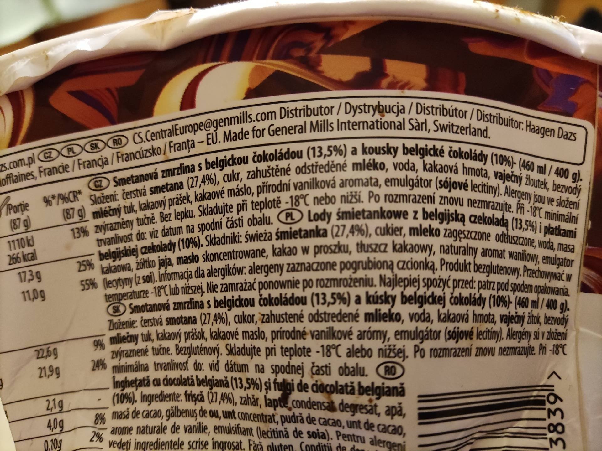 Smetanová zmrzlina s belgickou čokoládou (13,5%) a kousky belgické čokolády (10%).