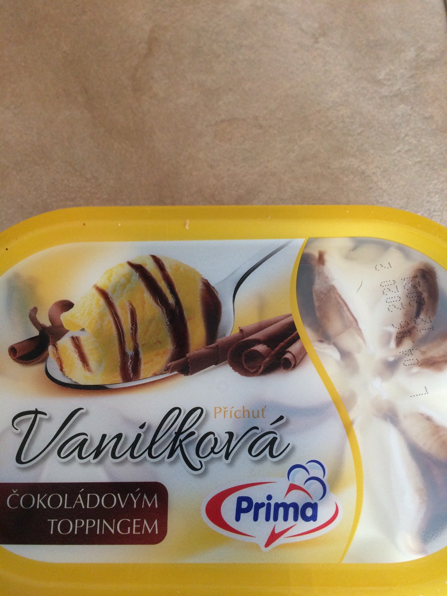 Mražený krém s rostlinným tukem s vanilkovou příchutí a čooládovým toppingem.