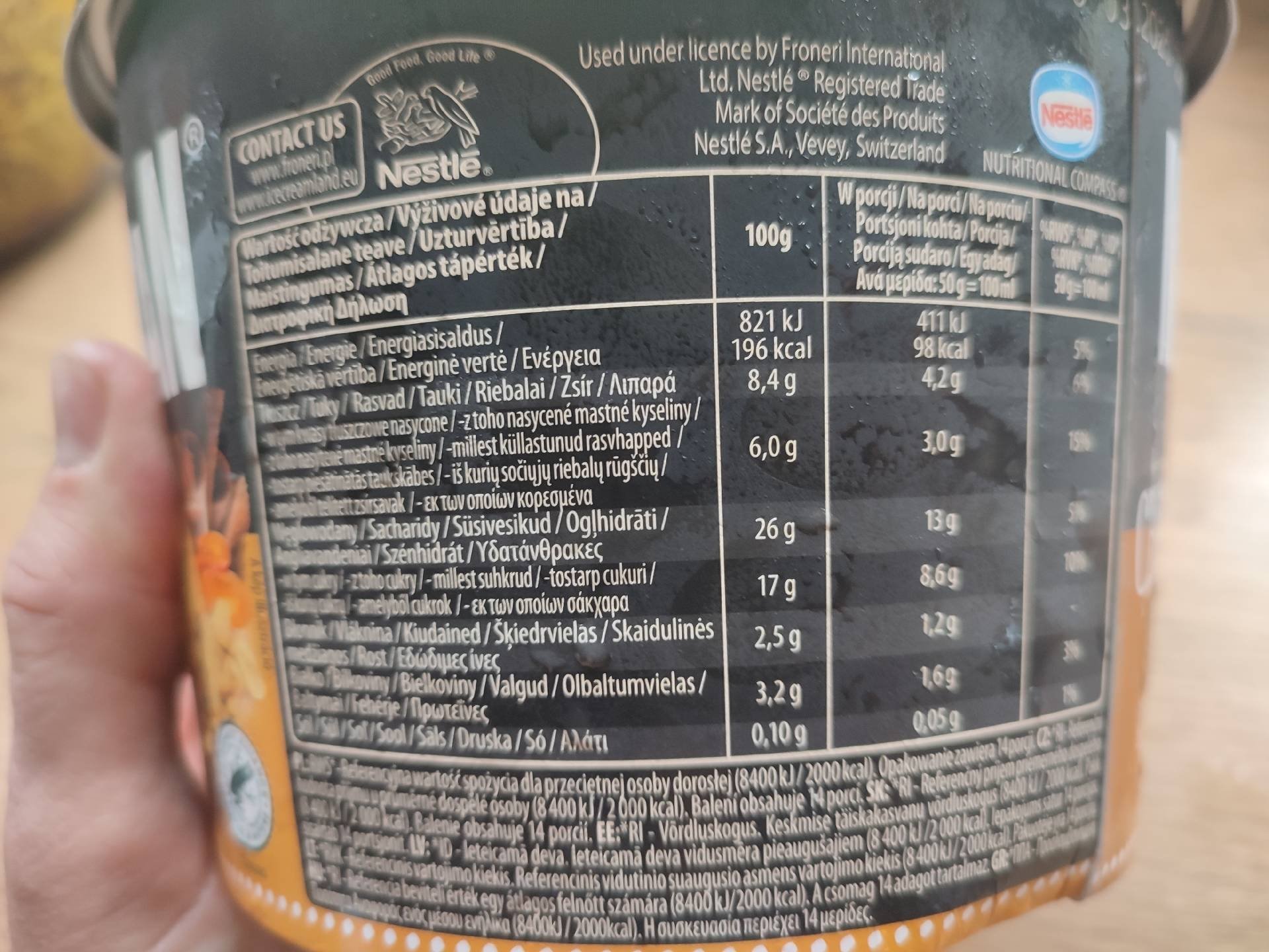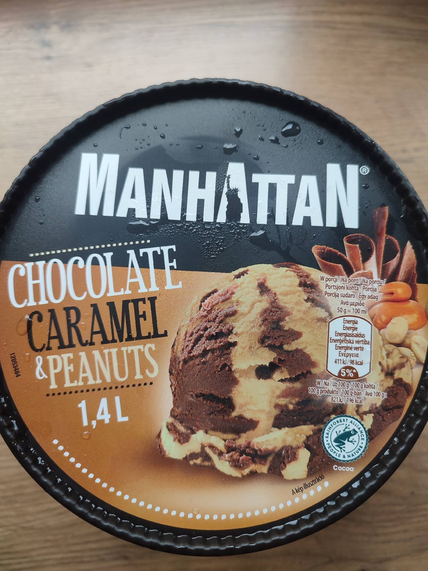 Mražený krém s rostlinným tukem čokoládový a karamelový s kousky pražených arašídů.