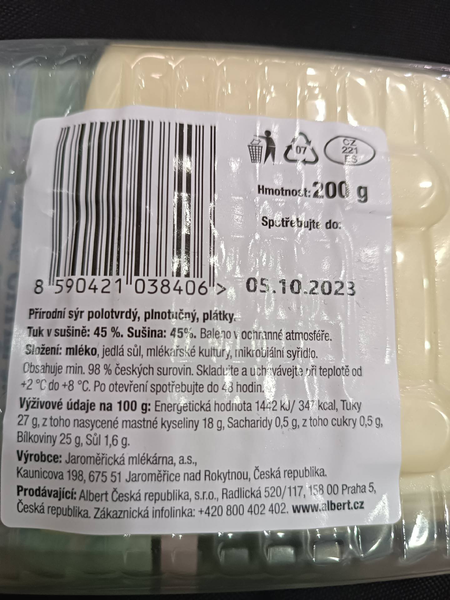 Přírodní sýr polotvrdý, plnotučný, plátky.