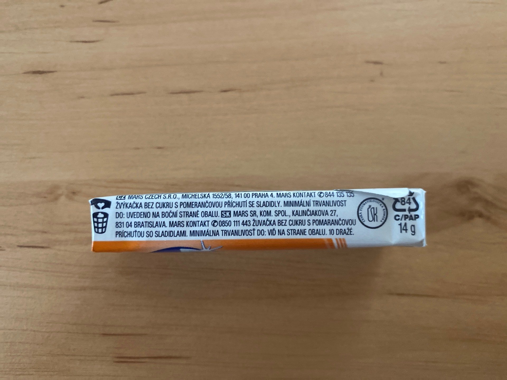 Žvýkačka bez cukru s pomerančovou příchutí se sladidly.